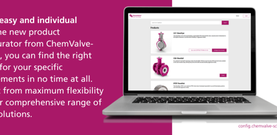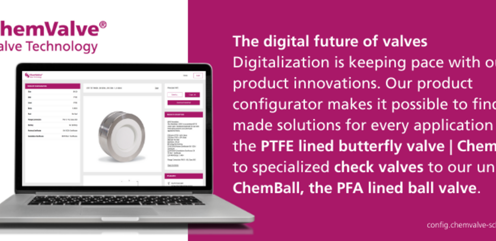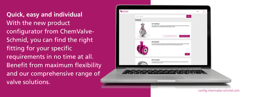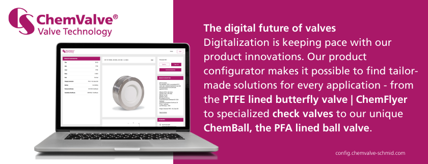 Digitalization is keeping pace with our product innovations. Our product configurator makes it possible to find tailor-made solutions for every application - from the ChemFlyer PTFE lined butterfly valve to specialized check valves to our unique ChemBall PFA lined ball valve.