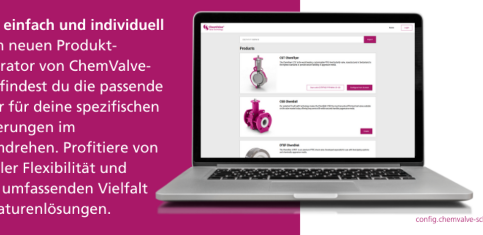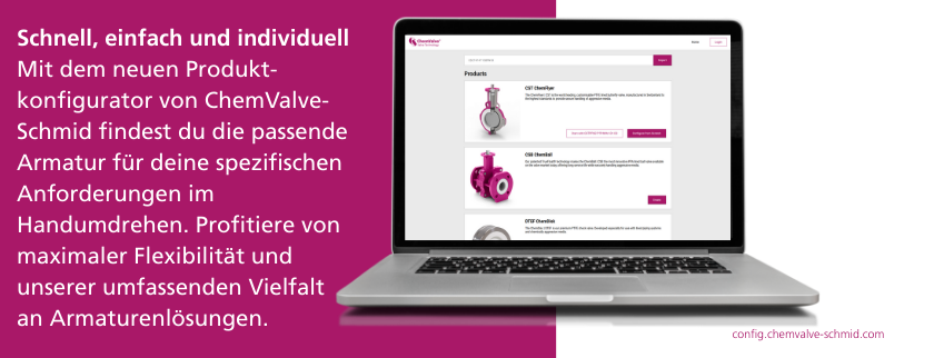 Wir bei ChemValve-Schmid setzen auf Innovation und Kundenorientierte Lösungen. Mit unserem brandneuen Produktkonfigurator bieten wir Handelspartnern und Endverbrauchern eine intelligente Möglichkeit, die perfekte Armatur für ihre individuellen Anforderungen zu finden.