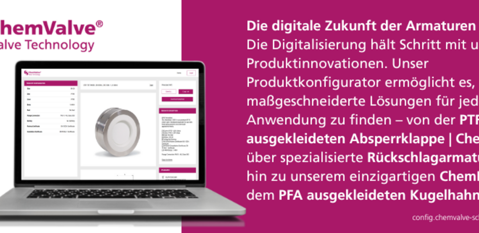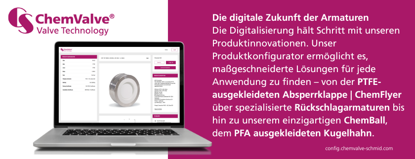 Die Digitalisierung hält Schritt mit unseren Produktinnovationen. Unser Produktkonfigurator ermöglicht es, maßgeschneiderte Lösungen für jede Anwendung zu finden – von der PTFE-ausgekleideten Absperrklappe | ChemFlyer über spezialisierte Rückschlagarmaturen bis hin zu unserem einzigartigen ChemBall, dem PFA ausgekleideten Kugelhahn.